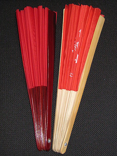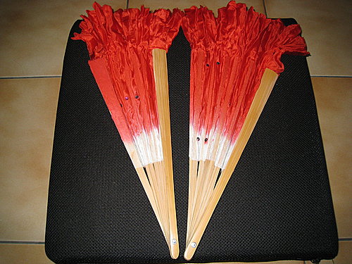 這是我的兩把扇子。左邊赭紅色扇柄的,是老媽以前跳舞時買的,她已經不用,就送給我,扇柄很堅固,我很喜歡。右邊原木色的是以前參加團練時向老師買的,材質比較普通,上次練習時還不小心戳到了大腿,有一枝扇柄就這樣被折了,我看它並沒有完全斷掉,所以就用膠帶黏上,還是可以拿來用,怕它再被我打壞,要輕一點就是了。