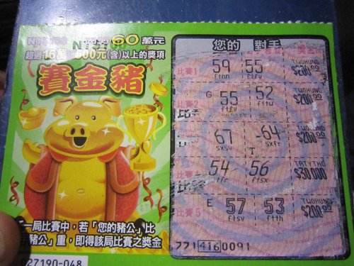 吃完已經九點半,沒想到那攤子真的還在,掏出一百元買了一張,選了金豬,