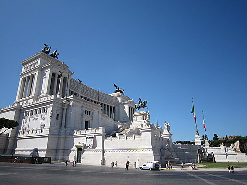 走到正面來看,紀念堂前面有艾曼紐二世騎馬雕像,