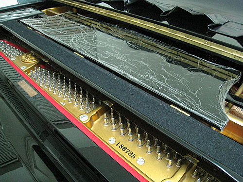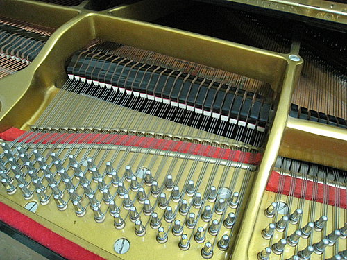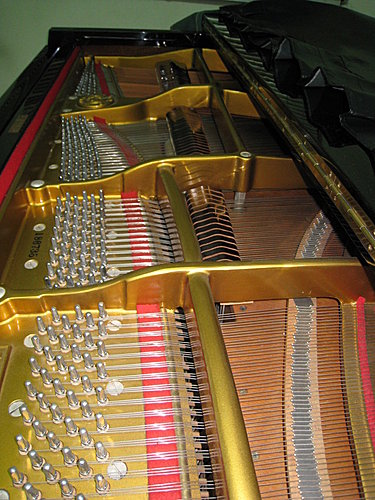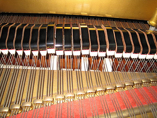 譜架拿掉之後,就是所有的絃,依照半音排列得很整齊。低音部分的絃很粗,只用一根;中高音部份的絃都有三根。(半音就是兩個相鄰的音,黑鍵和白鑑都算。)