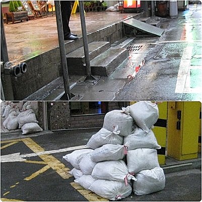 那時我剛好沒帶相機在身上,實在很想拍,於是趁著雨勢變小,脫了鞋子就在水裡走了幾公尺,上了走廊,我拎著鞋子、光著腳丫子走,有幾個路人在看,我卻像個頑皮的小孩,覺得好久沒玩水,終於讓我玩到了,自己覺得真好笑。路上大樓警衛已經堆起沙包,還在停車場入口放了擋板,就是怕水真的漫上來。