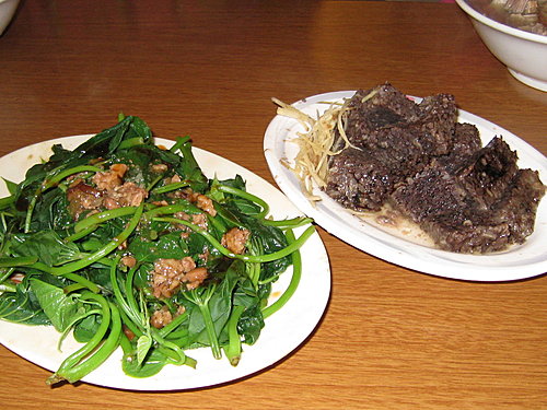 還點了一盤燙青菜和鴨血糕,可以自己拿沾醬,妹妹還強調是西螺的醬油膏喔。