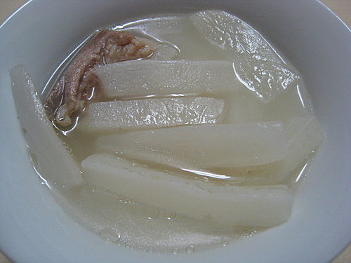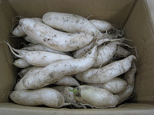 我本來還沒特別注意白玉蘿蔔有什麼不同,昨天另一個同事解釋給我聽。她說她週末去買菜時,特別注意了一下,有一攤有兩堆蘿蔔分開放,一堆是我們一般看到大大的那種,一堆就像我這些,老闆說那是白玉蘿蔔,是日本品種拿到台灣來種的。據說以前還有一種瘦瘦長長的蘿蔔,是日本品種在大陸種、再銷到台灣來的,現在大概沒人要買大陸貨了吧。但如果是日本進口的蘿蔔,可就不便宜了。