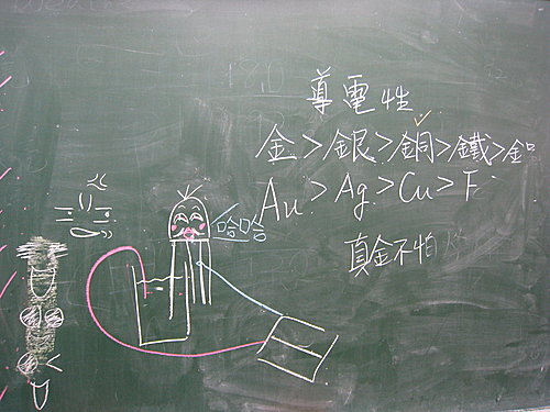 他們今天用了幾種溶液和二極體作導電性,老師先畫圖講解,之後分組領材料做。做完之後,開始在黑板下結論,大家就發現二極體上有臉,一直笑個不停。下課後有幾個還湊上去加字、畫臉和章魚腳,大家都在猜是誰畫的,問了很久才有人承認,結果就是沒交回二極體的那組。最後為了他們上課不認真以及濫用公物,那組組員和有畫過黑板的,都讓我罰抄了兩篇古短文和語譯,有人十分鐘就交了,我還擔心這處罰太輕,未來他們還會再犯。