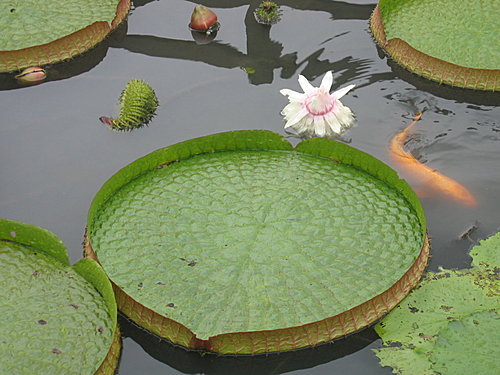 世界最大蓮花-大王蓮,葉子可載人。花晚上開,第一天是白色,第二天粉紅,第三天深紅,然後就凋謝了。左上角是花苞。