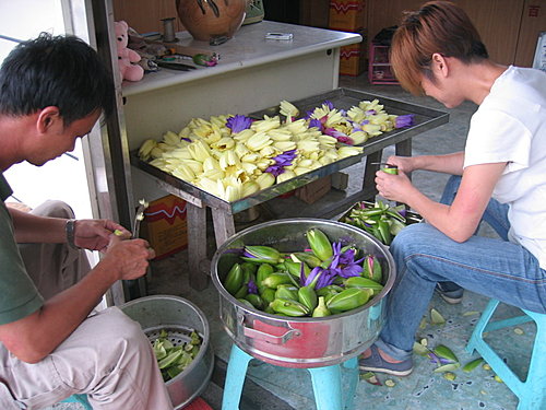 老闆有點木訥,但問起蓮花,卻朗朗上口。他們正在剝去花外的綠色部分,老闆說蓮花主要是拿來做香料,就是像香水之類的東西囉。