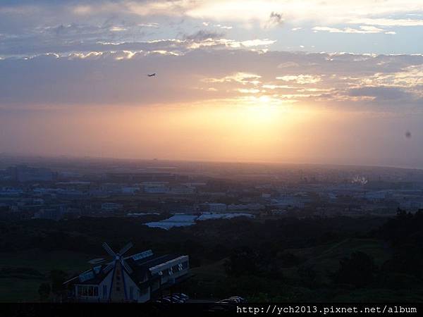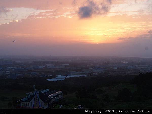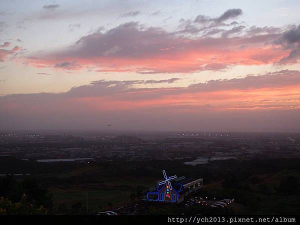 星海之戀的大風車亮了燈,機場也亮了兩排燈,大概是不同的航廈吧。