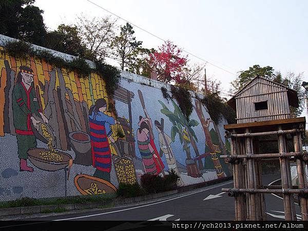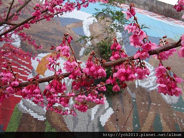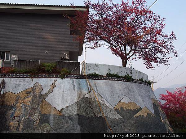牆上的原住民朋友指著上面的櫻花,別說你沒看到喔。