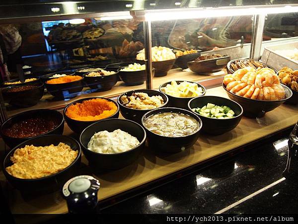 一碗一碗的食材擺放在櫃子裡,看起來很好吃,好誘人!