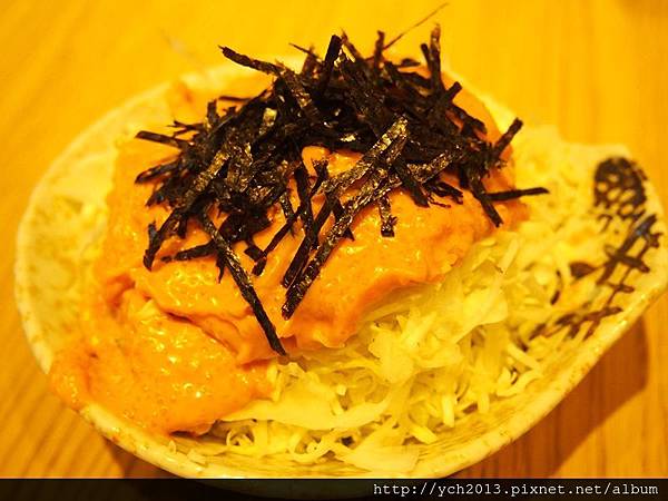 這是魚卵海膽沙拉,一份80元,海膽用沙拉醬調味後,再加入魚卵,