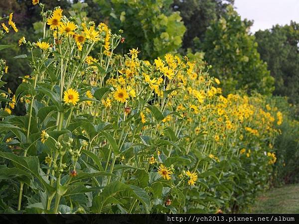 一排漂亮的黃色菊花,有點像向日葵,但沒那麼大朵。