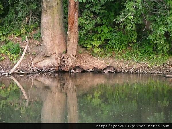 河的對岸有兩隻毛茸茸的動物,看那尾巴就知道是浣熊。