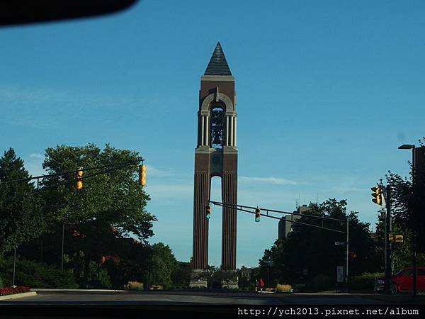 高高的鐘樓就在校園裡的路中央,很顯眼,