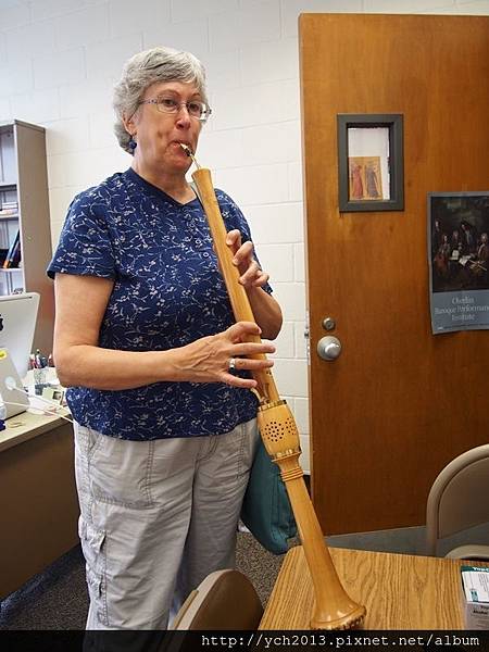 這樂器看起來像木笛,但吹嘴是雙簧片,類似現在的低音管。