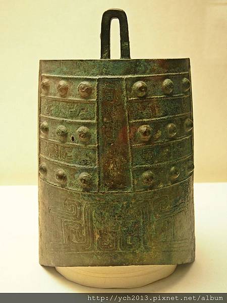 商代後期的獸面紋大鐃,看起來很重,長柄甬中空,可插在座上。