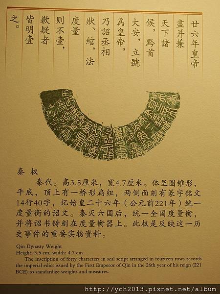 上面刻有篆字銘文14行40字,記載始皇二十六年(公元前221年)統一度量衡的詔文。