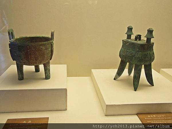 左邊是或鼎,右邊是冊方斝(ㄐㄧㄚˇ),都是商代後期的酒器。