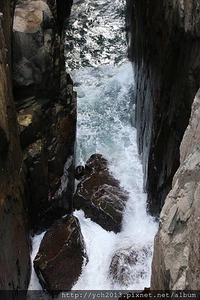 兩大岩壁靠再一起,中間有一縫隙,海水不同沖進來。