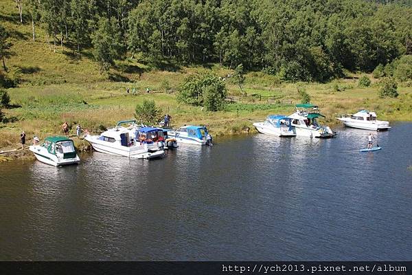 望向下方河邊,有幾艘汽艇,還有人站著划小舟。