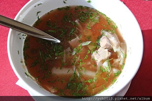 羅宋湯裡灑上蒔蘿,味道很明顯,有團員無法接受就不喝了。