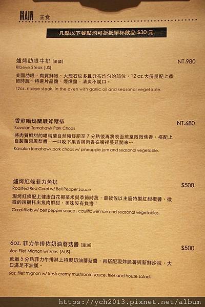 排餐有肋眼牛排、戰斧豬、紅條菲力魚排和菲力牛排四種選擇,