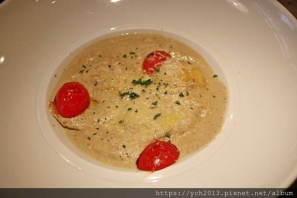 蘑菇白醬蕃茄起司義大利餃,餃子都被蘑菇白醬淹沒了。