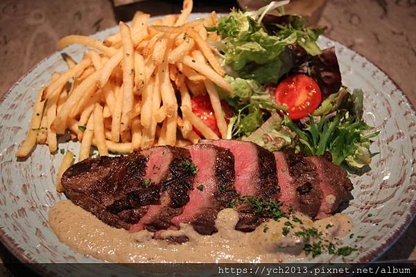 我們的主餐是6盎司菲力牛排佐奶油蘑菇醬,還附有薯條和沙拉,非常豐富。