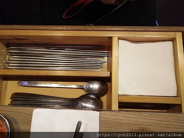 餐具就放在桌子下方的抽屜裡,自行取用。
