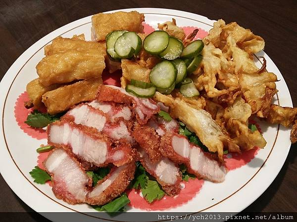 最先上桌的是炸物拼盤,有紅糟肉、蝦捲和牛蒡天婦羅,