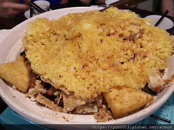 端上來的時候上面一層蛋酥,蓋在滿滿的料上面。