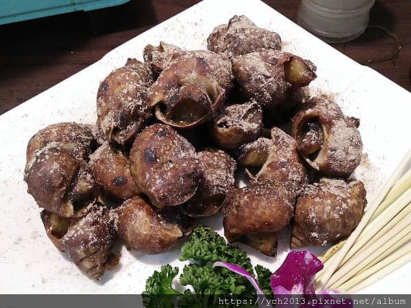 胡椒風螺看起來黑黑的,上面一層厚厚的胡椒粉,吃起來有辣度喔。