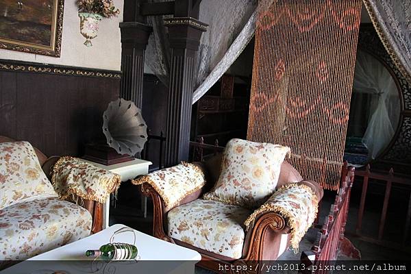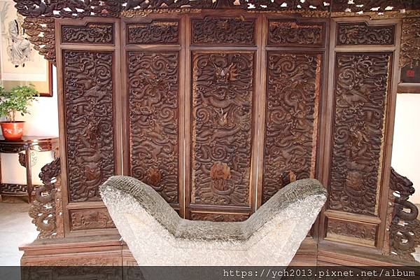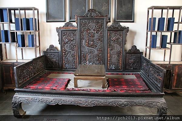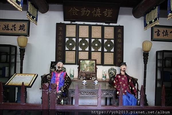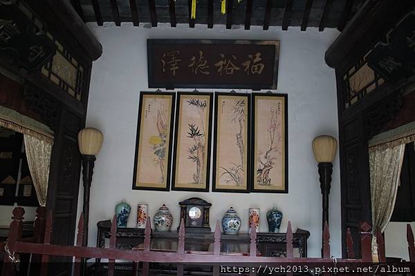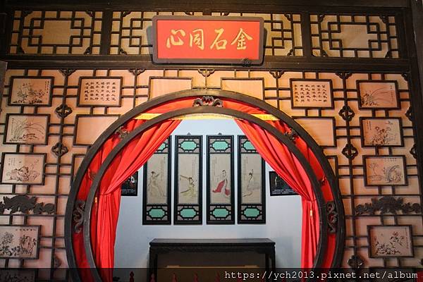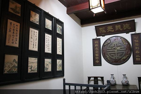 側廳牆上的字畫好典雅。另一邊則是好幾層紅帳的臥房。