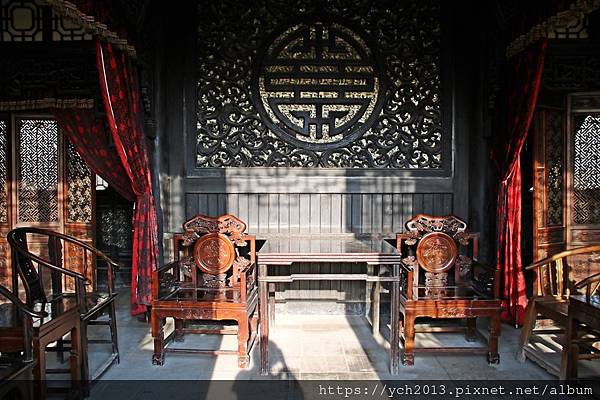 側廳桌椅、花瓶、牆上字畫與裝飾都好古典。