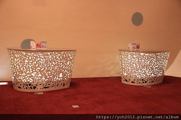 走上樓梯,來到二樓大堂,這桌子好像鏤刻的燈箱。