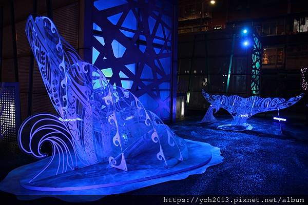 廣場上有"鯨夜躍您來",大鯨魚配合藍紫色光,很有海洋的感覺。