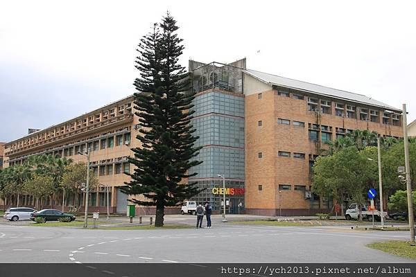 斜對面這棟英文字的顏色很顯目,一看就知道是化學系。
