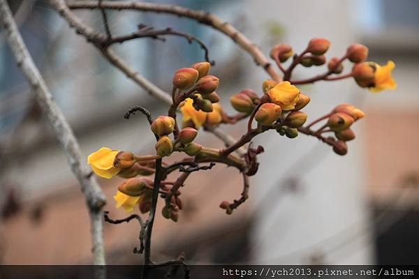 門口的樹都掉光了葉子,但看得見黃色花苞。