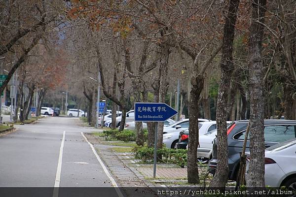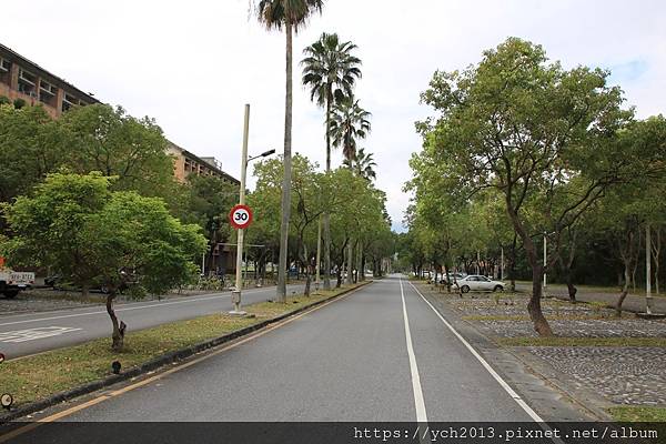 往圖書館方向走,有林蔭大道,旁邊也有汽車停車格。