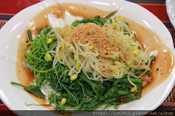 當天的馬告涼拌時蔬是龍鬚菜,上面還加了豆芽菜和花生粉,
