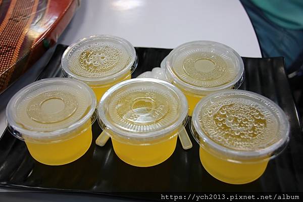 餐後有果凍,看起來像茶凍,其實是百香果凍喔。