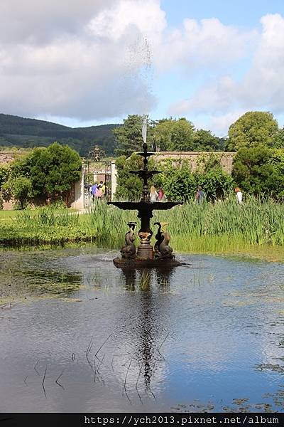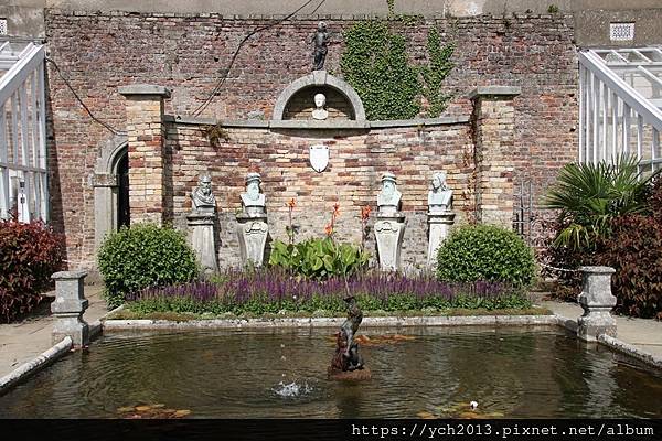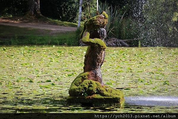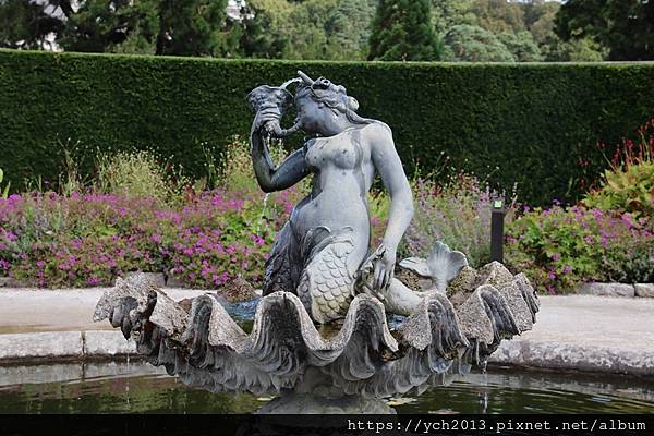 這個小噴泉池有個吹海螺的美人魚,是鮑爾斯考特領主在倫敦收集到的,