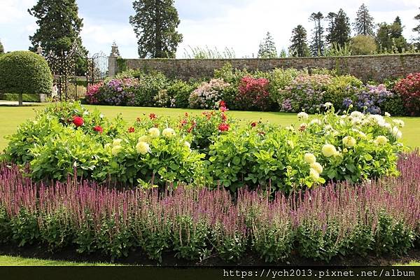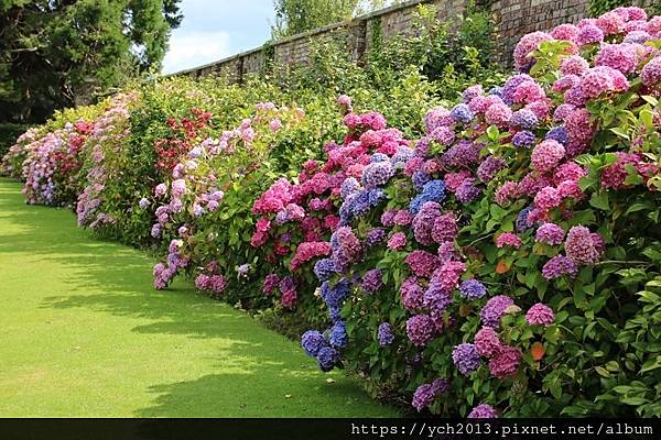 牆邊的繡球花開得很美,不過不能踩草皮進去喔。