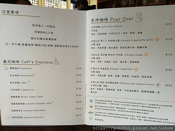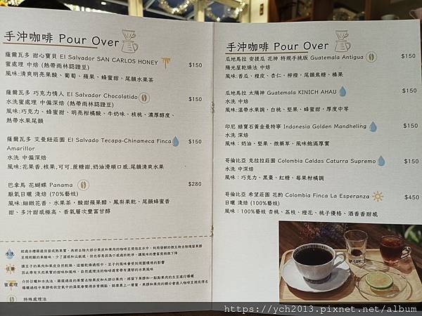 第二頁是淺焙手沖咖啡,有較多水果香與花香,口感偏酸。