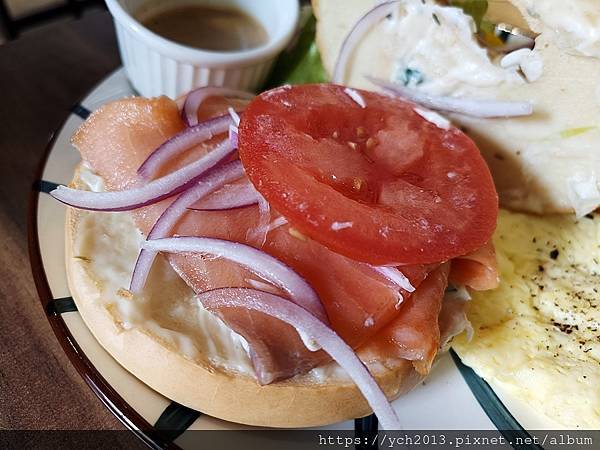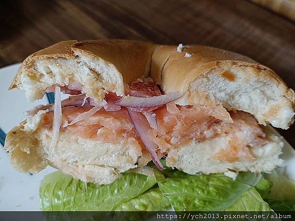 燻鮭魚貝果除了有燻鮭魚片,還有番茄和洋蔥,