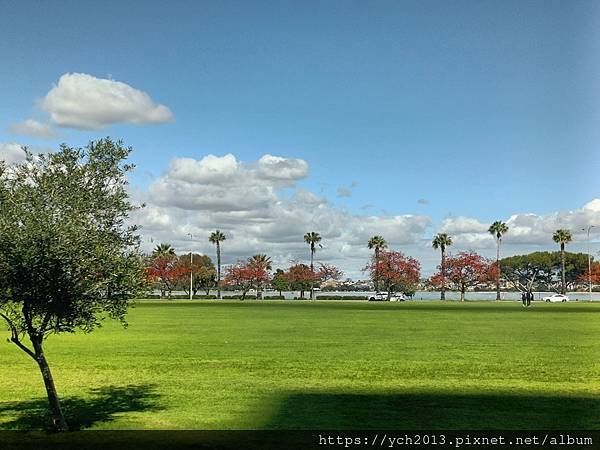 經過了飯店附近靠河邊的公園,看到了一排開紅色花的植物,