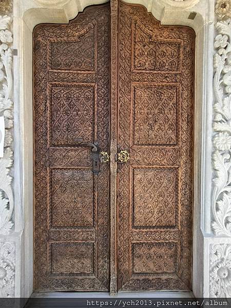 經過長長的坡道,來到第一道門,拱門上方的小窗就有壁畫喔。